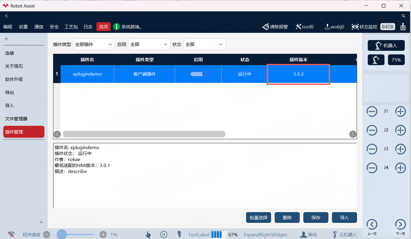 用户将的需要升级的插件压缩包准备好,与安装插件同一步骤,启动HMI界面。进入选项-插件管理-导入压缩包,此时插件状态会显示异常字样,下方详细状态提示等待升级,点击保存,插件即可自动重启,完成升级。