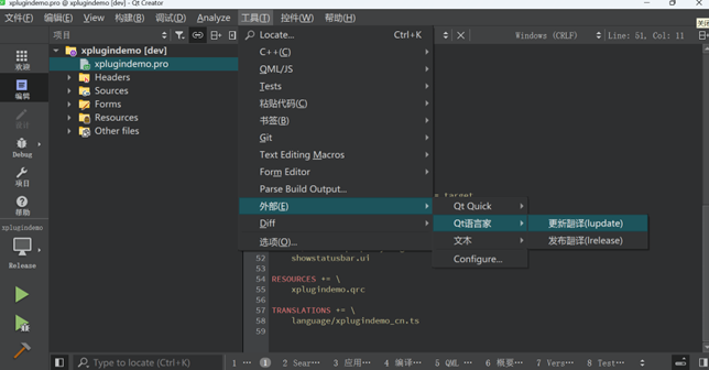 **第一步:**在Qt工程的pro文件中,加入(TRANSLATIONS += language/xplugindemo_cn.ts) 设置生成 .ts 文件的路径。