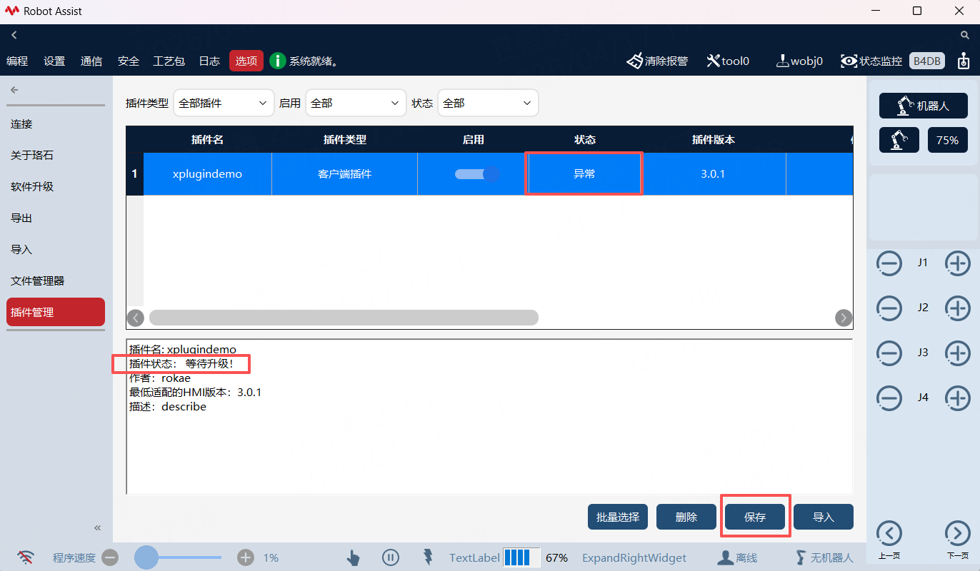 用户将的需要升级的插件压缩包准备好,与安装插件同一步骤,启动HMI界面。进入选项-插件管理-导入压缩包,此时插件状态会显示异常字样,下方详细状态提示等待升级,点击保存,插件即可自动重启,完成升级。