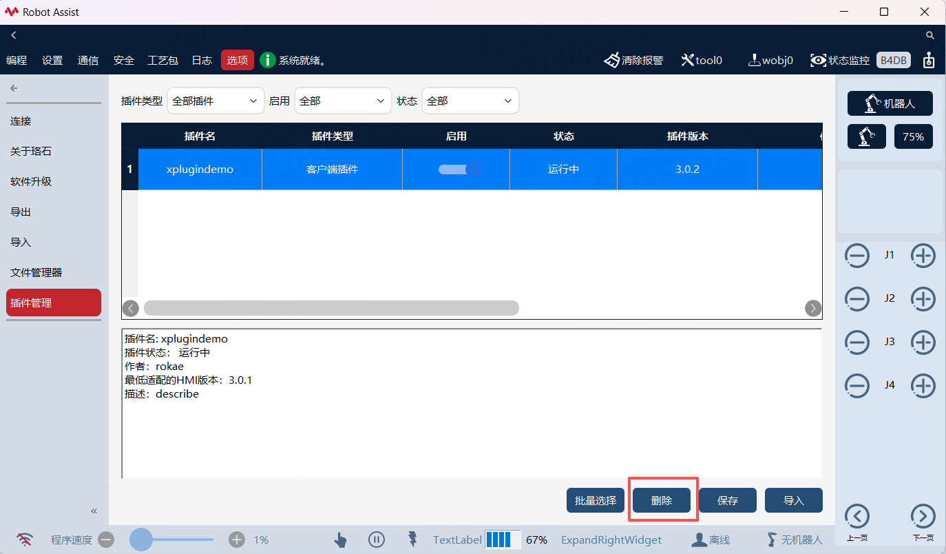选中一个插件,点击右下角删除,删除后点击保存。HMI或者控制器将进行自动重启,即完成插件卸载操作!
